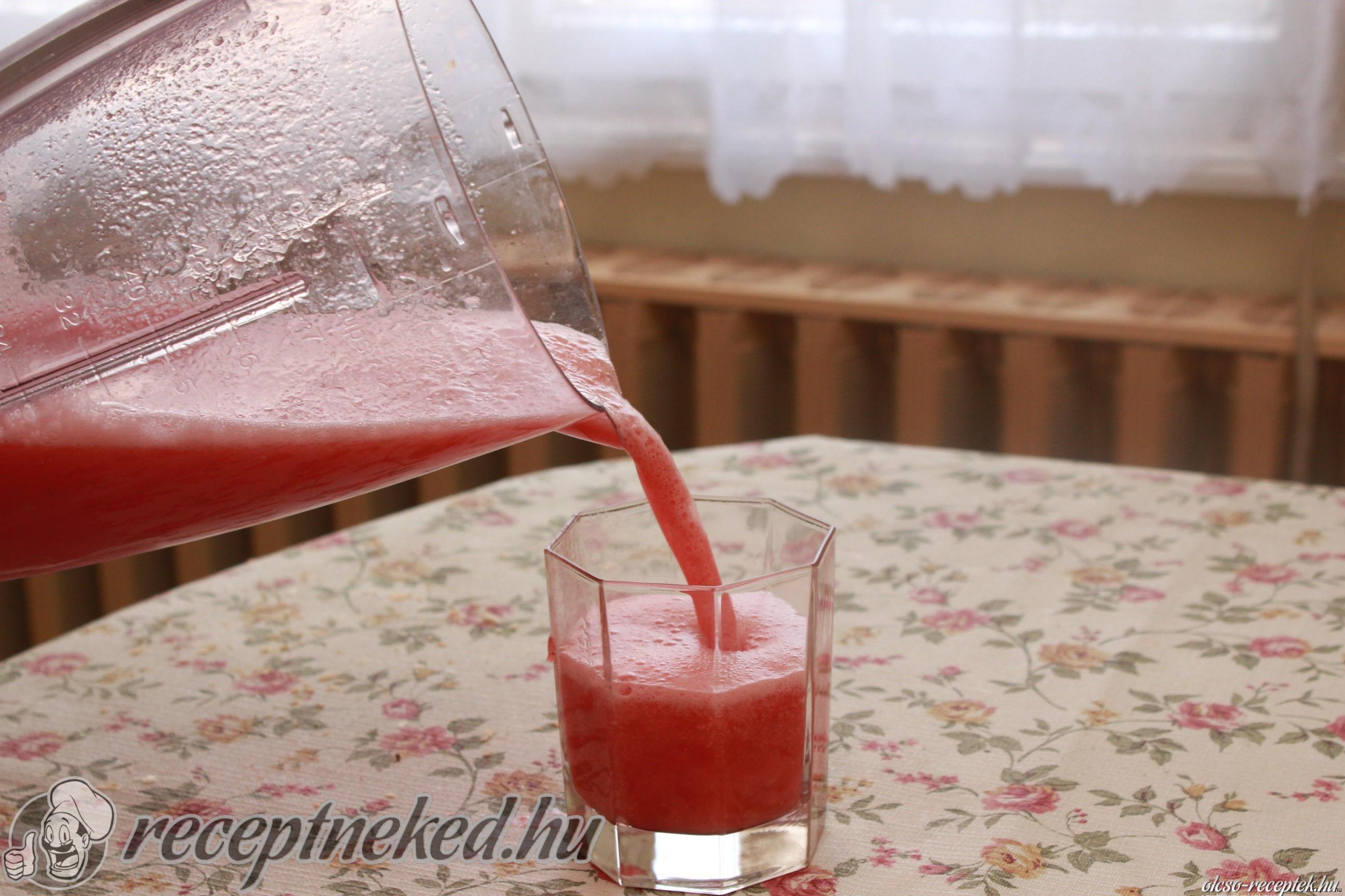 A dinnye szeletet kimagozzuk, majd kis kockákra vágjuk, hogy beférjen a turmixgépbe. Ha beletettük a turmixgépbe egy fakanállal megnyomkodjuk, hogy eresszen egy kis levet. Alaposan összeturmixoljuk. Ha nem elég édes tehetünk bele cukrot, de ha jó dinnyét választunk nem lesz vele baj. Picit vodkával keverve, kínálhatjuk vele vendégeinket is 🙂