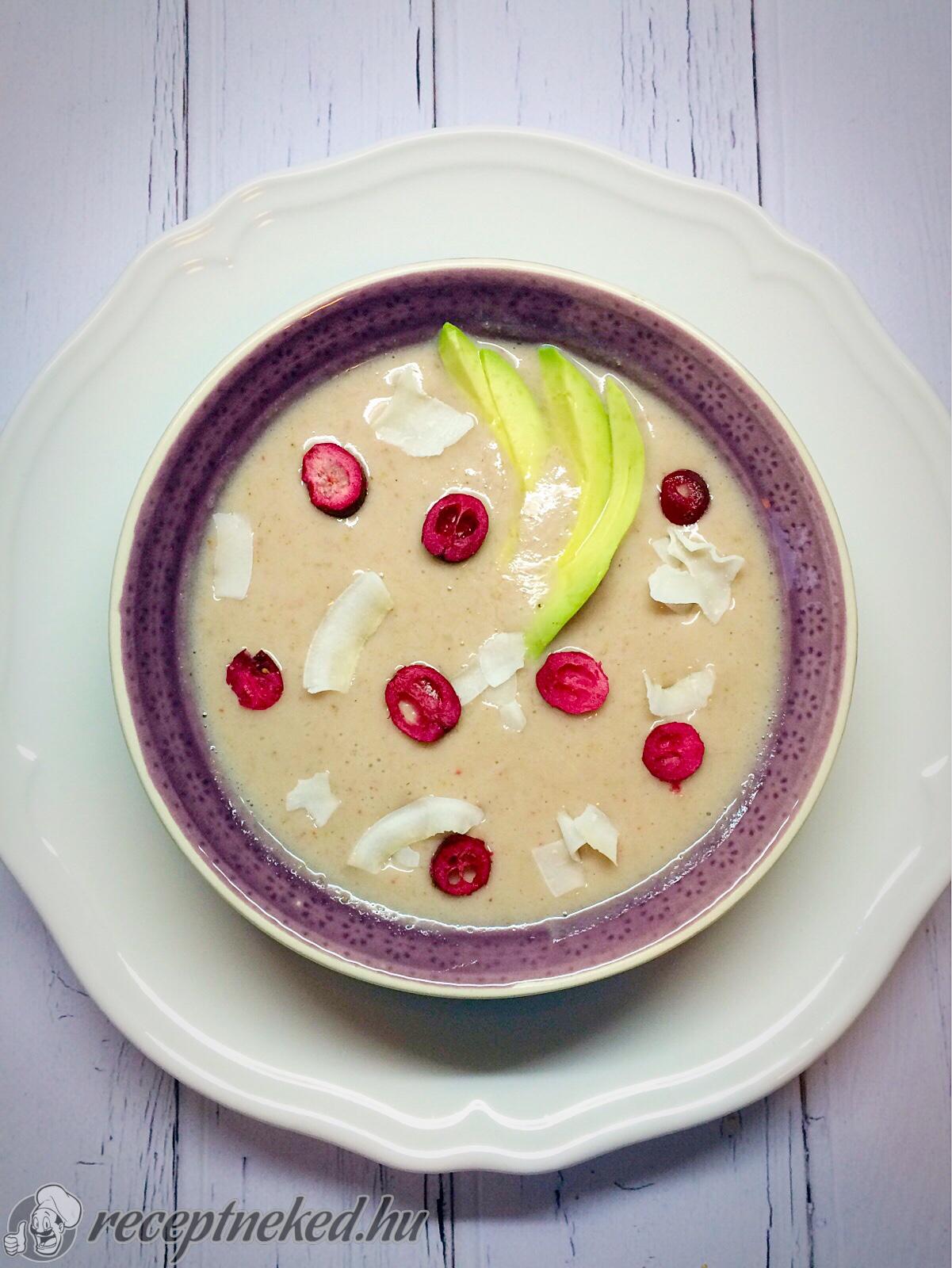 Díszítsük a tálat avokádóval, áfonyával és kókusszal.