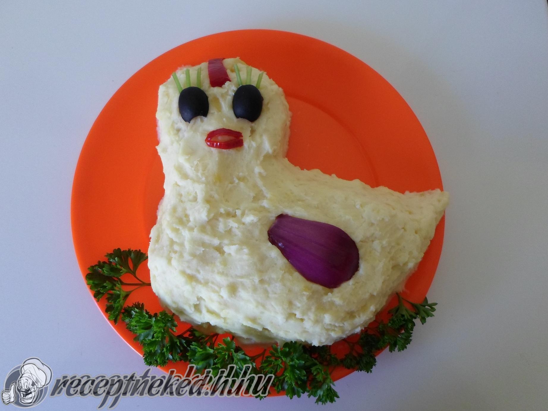 Egy tányérra halmozzuk, és csibe formát alakítunk ki belőle. Az olajbogyót kettévágjuk (ezek lesznek a szemei).