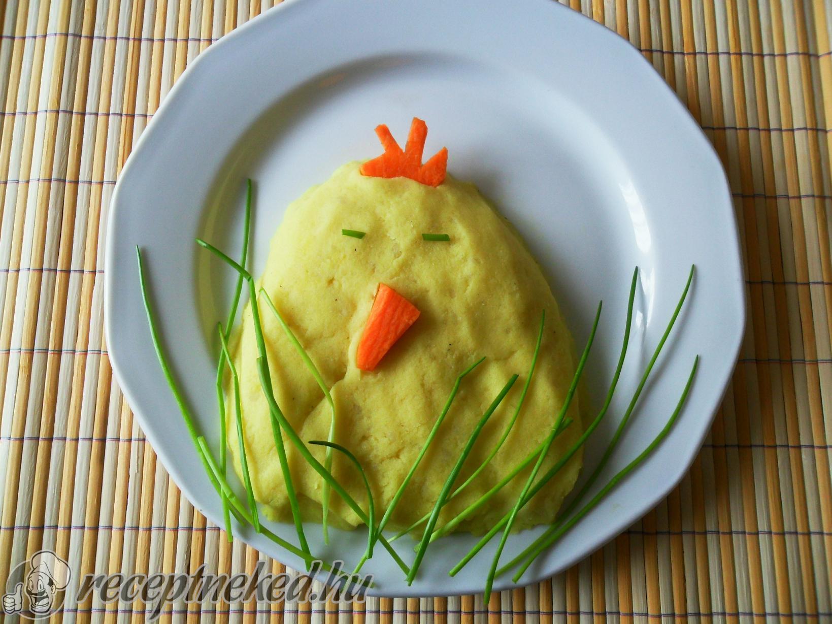 Krumplit meghámozzuk felkockázzuk és sós vízbe feltesszük főzni. Miután megfőtt leszűrjük és jól kikeverjük a tejföllel és a margarinnal. Adagonként egy tányérra halmozzuk, snidlinggel kirakjuk az alját és egy-egy kicsi darabot vágunk a szemének.
