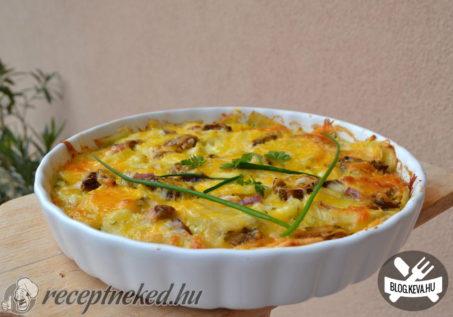Kivajazott tálba fektetjük a krumpliszeleteket és ráhelyezzük a hagyma karikákat, majd a gombát.