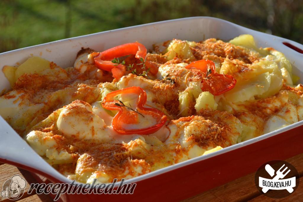Egy kerámiatálat vagy jénait kiolajazunk, zsemlemorzsával meghintünk és ebbe belerakjuk a víztől lecsepegtetett krumplit (ha egy-két evőkanál főzőlé rákerül nem gond, csak sok ne legyen, mert akkor szétázik a krumpli).