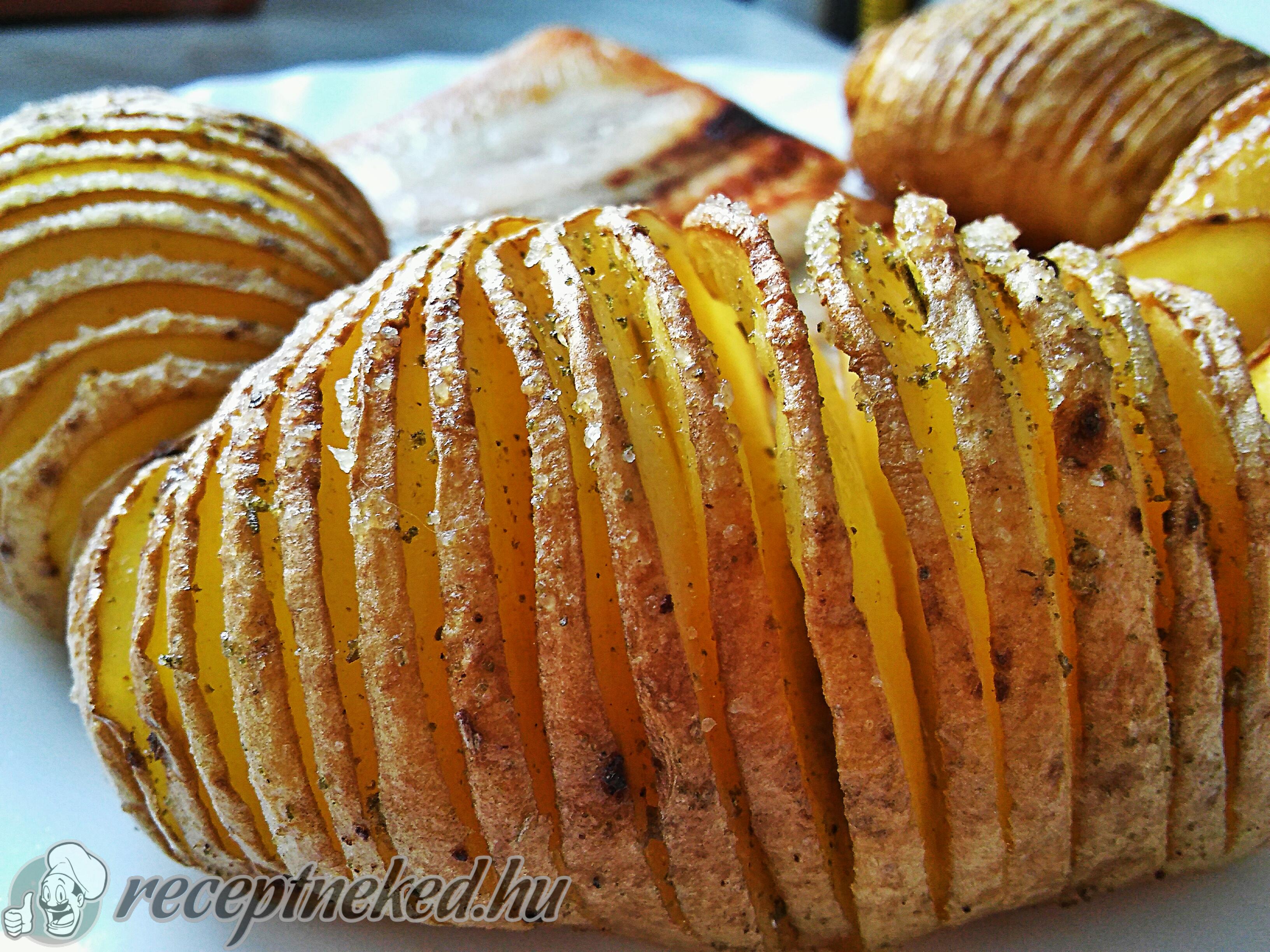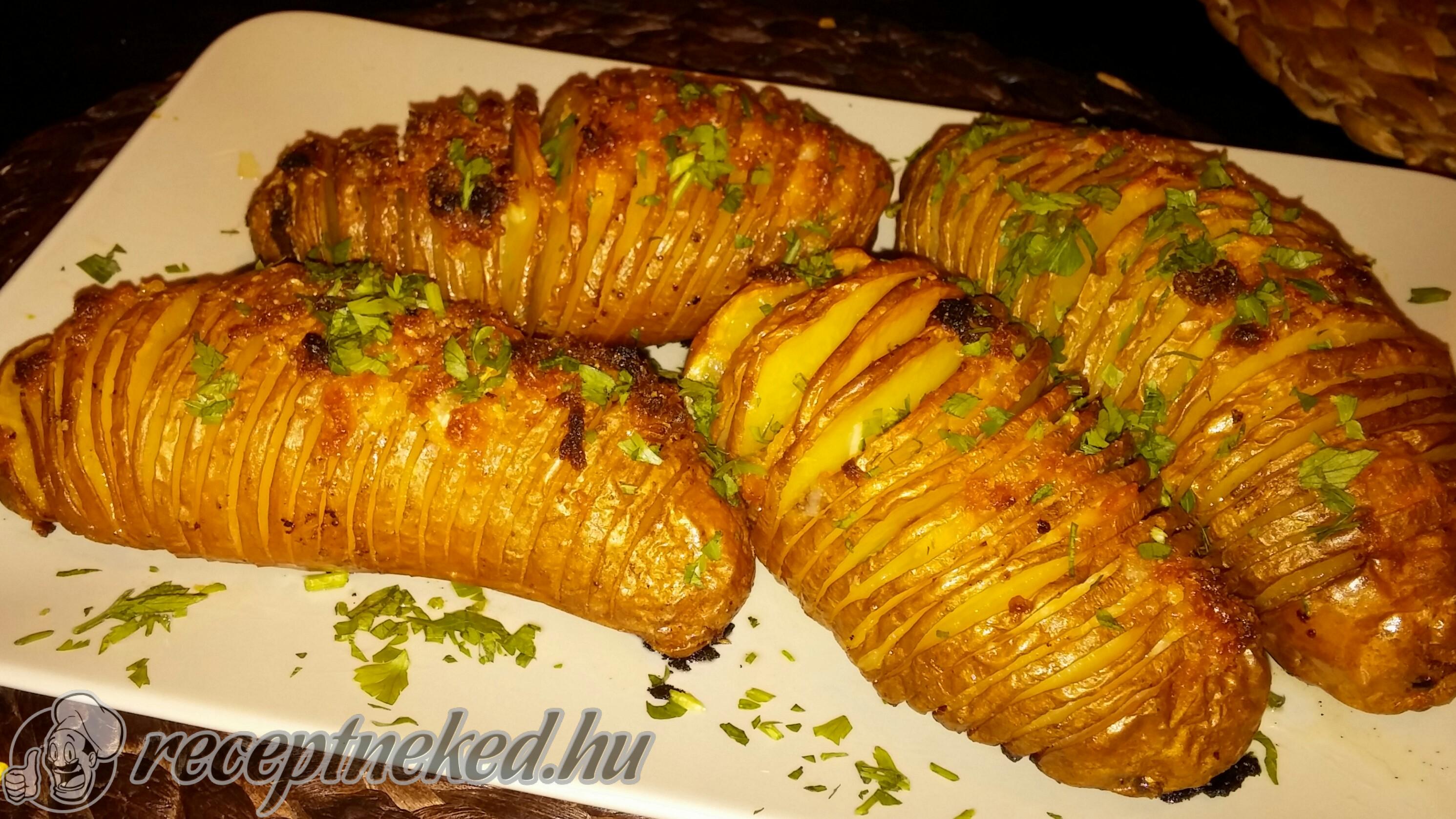 A bevagdosott krumplikat tegyük egy sütőpapírral bélelt tepsibe, majd sózzuk és borsozzuk úgy, hogy a bevágásokba is jusson.