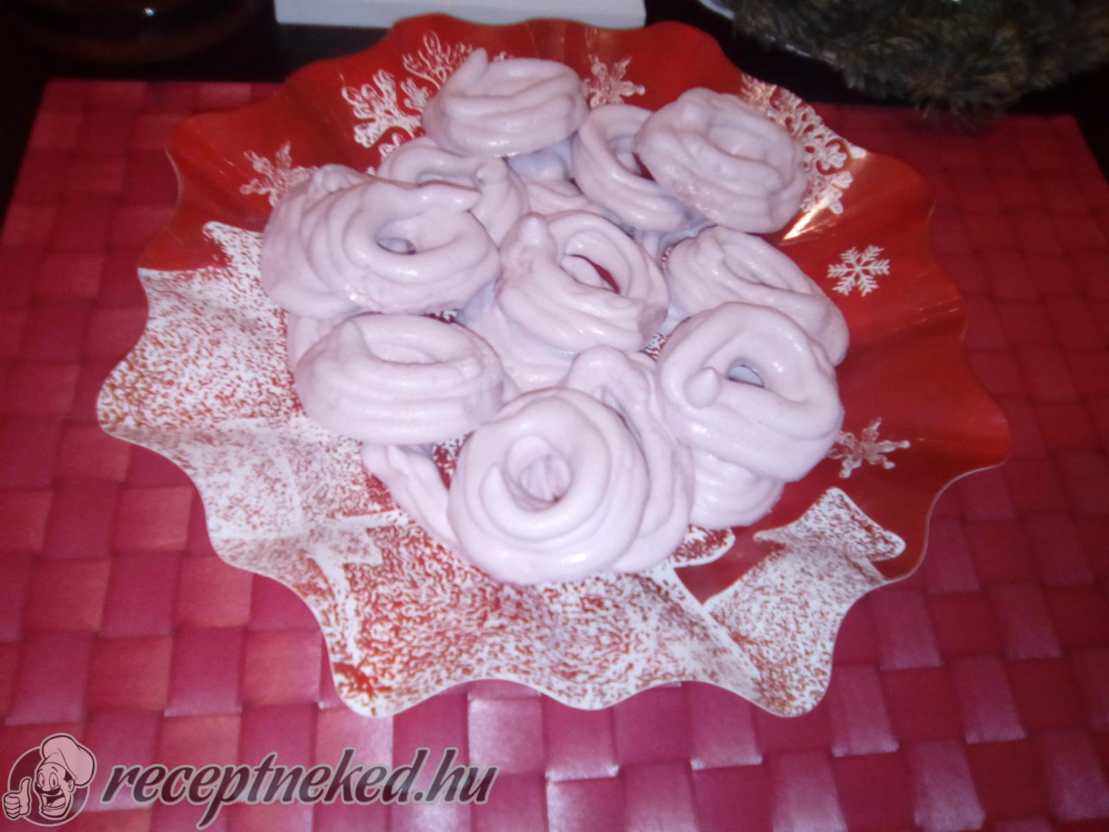 Csillagcsöves habzsákból emeletes karikákat nyomunk a tepsire. Ekkor betesszük a sütőbe, a sütő ajtaját egy fakanállal kitámasztjuk és 60 fokon szárítjuk 100 percen át. Ha elkészültek, akkor elzárjuk a gázt és a sütőben hagyjuk kihűlni.