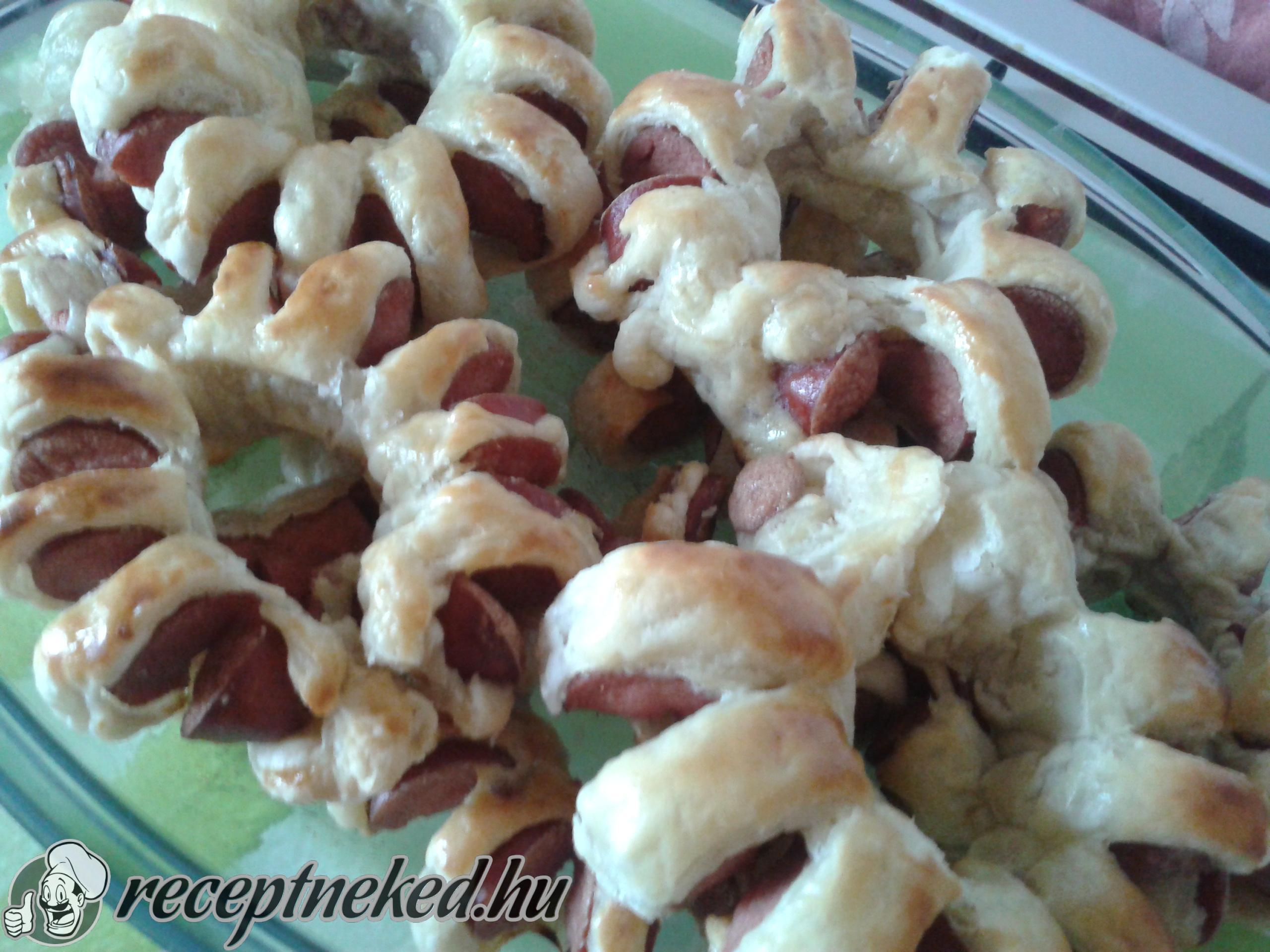 Beletekerjük a virsliket, bevagdossuk, de nem teljesen, majd kört formázunk belőle, és a két végén összenyomjuk a tésztát.
