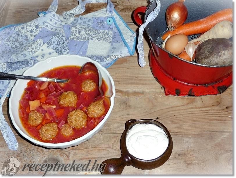 A céklát és a zöldségeket megtisztítjuk, majd ízlés szerint felkockázzuk. A vöröshagymát és a fokhagymát megpucoljuk, majd apróra felvágjuk.
