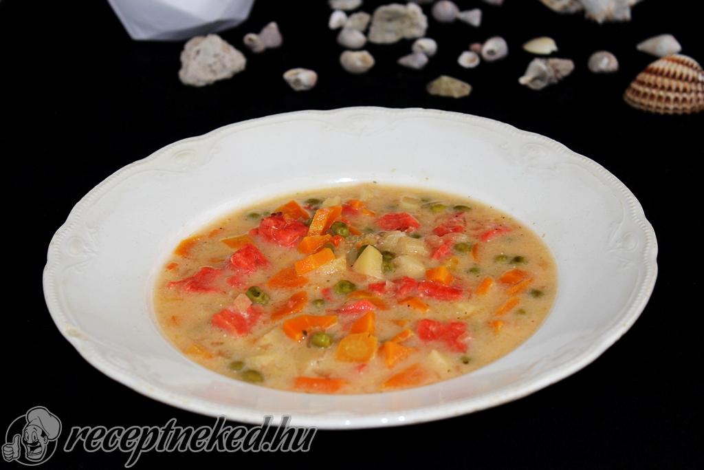 A tejfölt keverjük simára a kukoricakeményítővel és egy merőkanál forró levessel, majd állandó keverés mellett öntsük vissza a levesbe. Végül tegyük bele a felkockázott halat, majd óvatosan keverjük el és főzzük még 5 percig. Ezután vegyük le a tűzről, fedjük le és hagyjuk 10-15 percig állni.