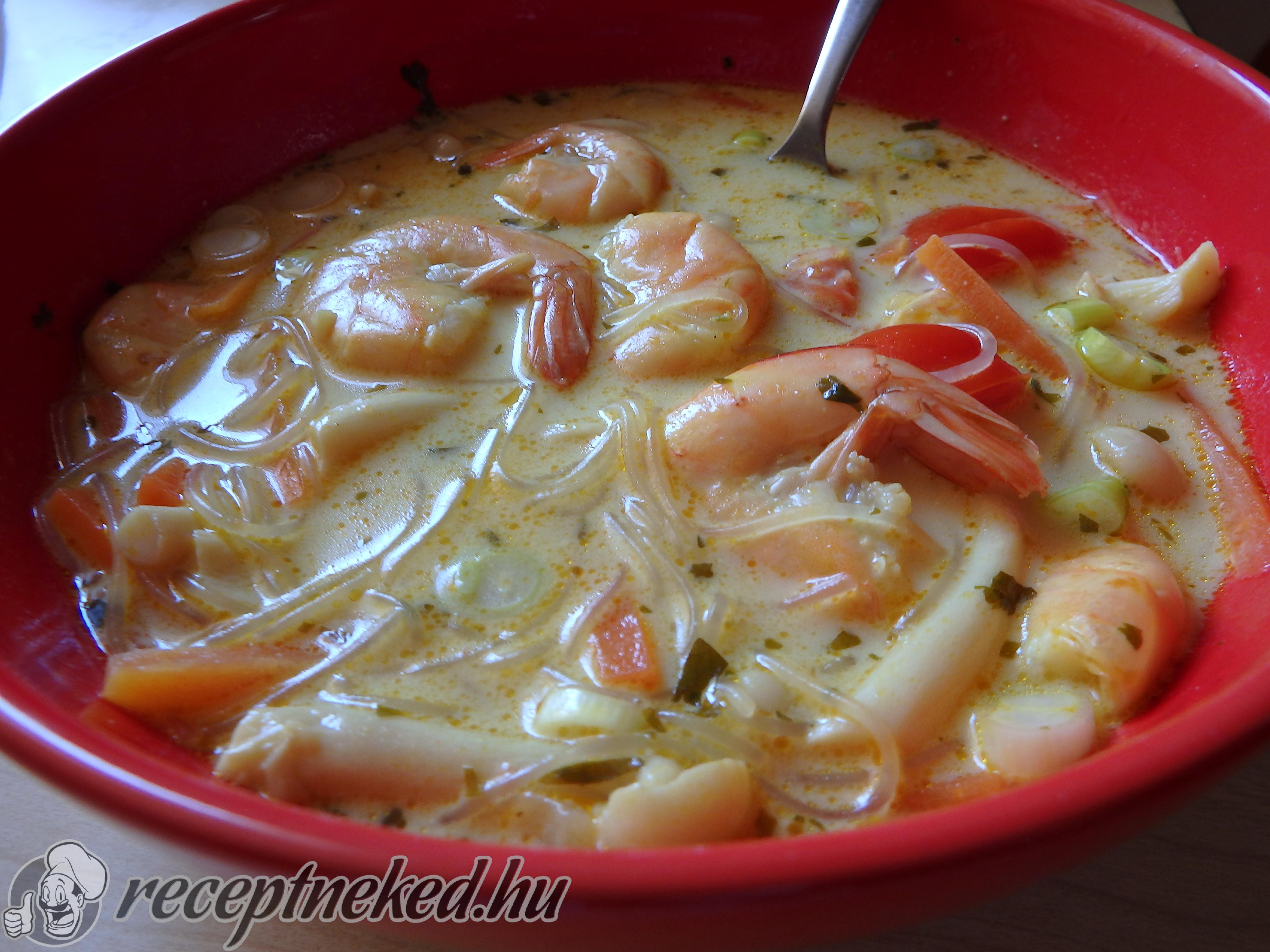 Az utolsó pár percben adjuk hozzá az üvegtésztát, a felkarikázott újhagymát, és garnélát is.