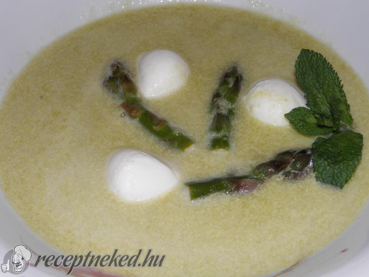 Tálaláskor 3-4 mozzarella golyóra szedjük a forró krémlevest, a spárgafejeket elosztjuk a tányérokban.