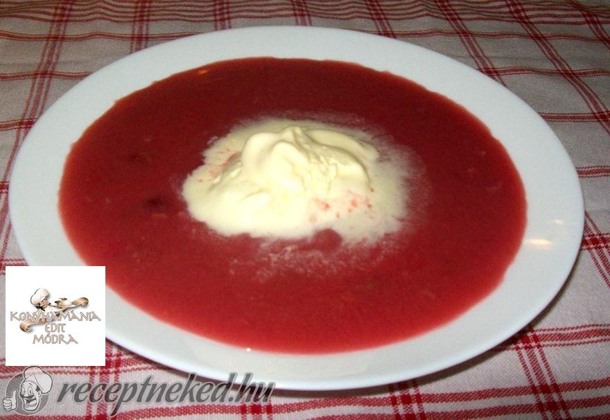 A gyümölcs 2/3 részét kivettem, összeturmixoltam, és visszaöntöttem a lábasba. Felöntöttem 2 liter vízzel. Amikor felforrt, belekevertem a vaníliás fagyit, ízesítettem 2 ek citromlével.
