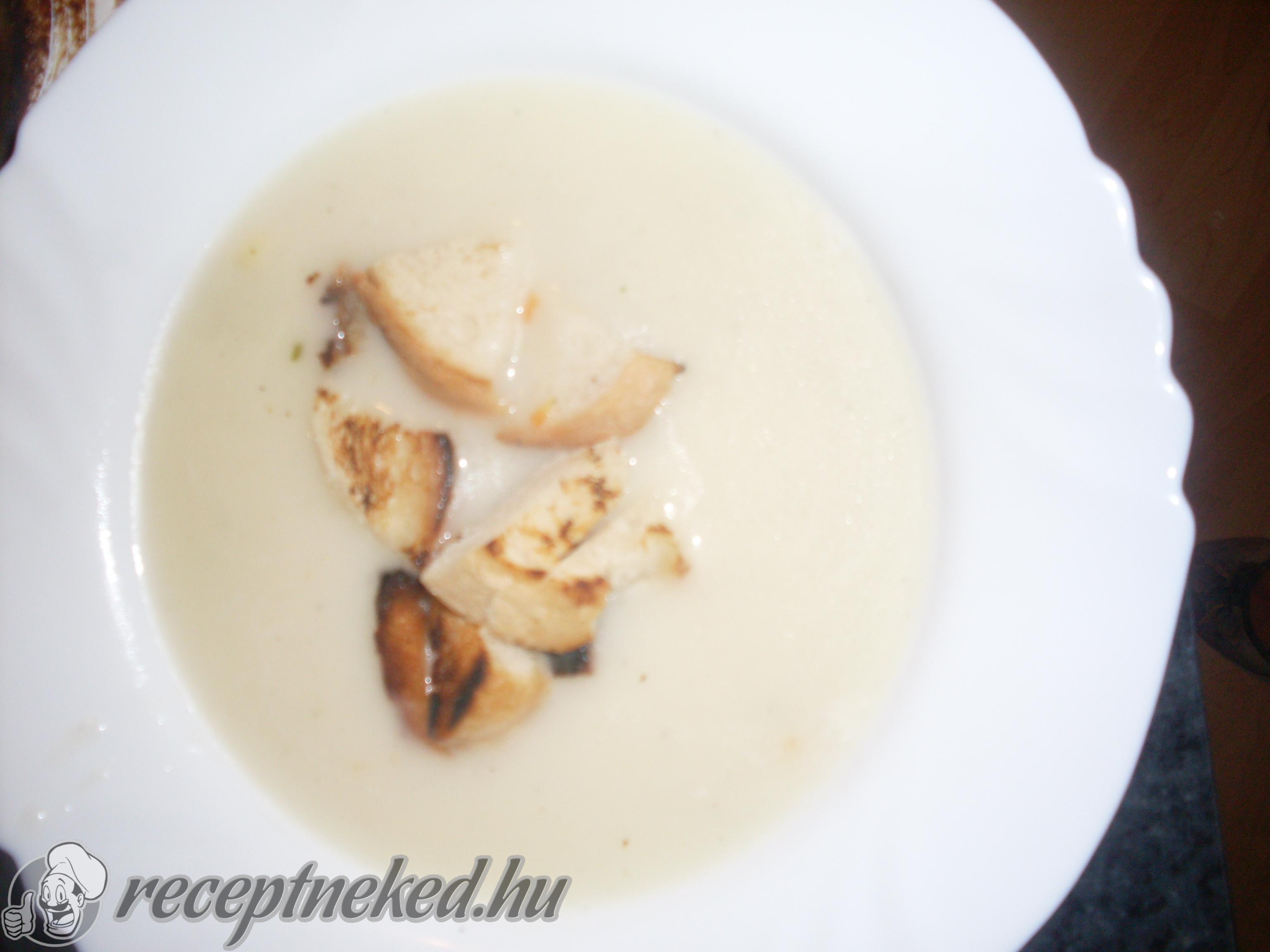 Ízlés szerint sóval és borssal ízesítjük. A kenyeret kis kockákra vágjuk, olajon megpirítjuk, és ezzel tálaljuk.