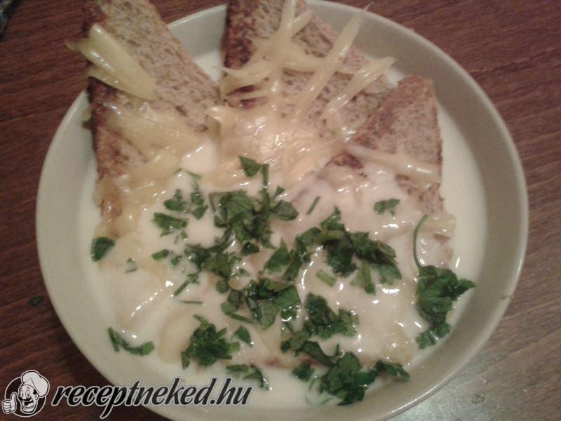 Közben pirítóst csinálok, melyre sajtot reszelek. Tálaláskor 1-2 pirítóst teszek a tányérba, erre merem a forró levest, majd ízlés szerint megszórom még aprított petrezselyem zölddel is.