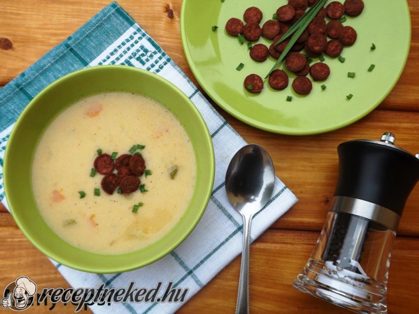 Melegen, virslichipssel és apróra vágott fokhagymaszárral meghintve kínáljuk.