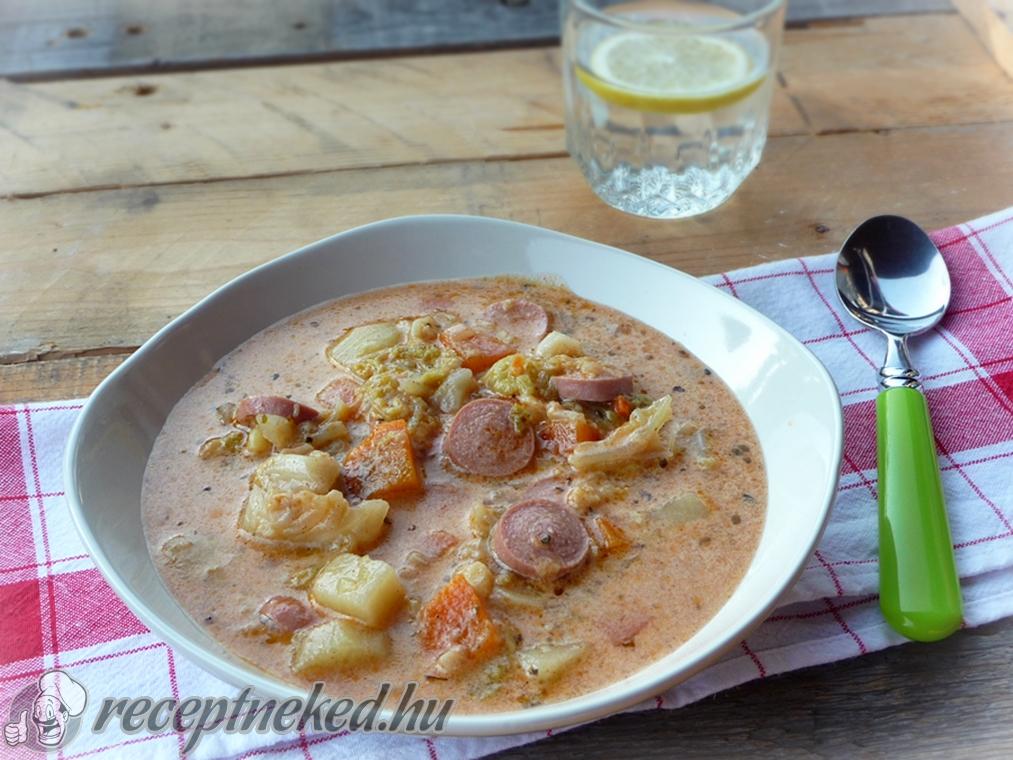 A zöldségeket tisztítsuk meg, és daraboljuk fel. A káposzta csumáját vágjuk ki, majd a káposztát vágjuk kisebb darabokra, a virslit karikázzuk fel.