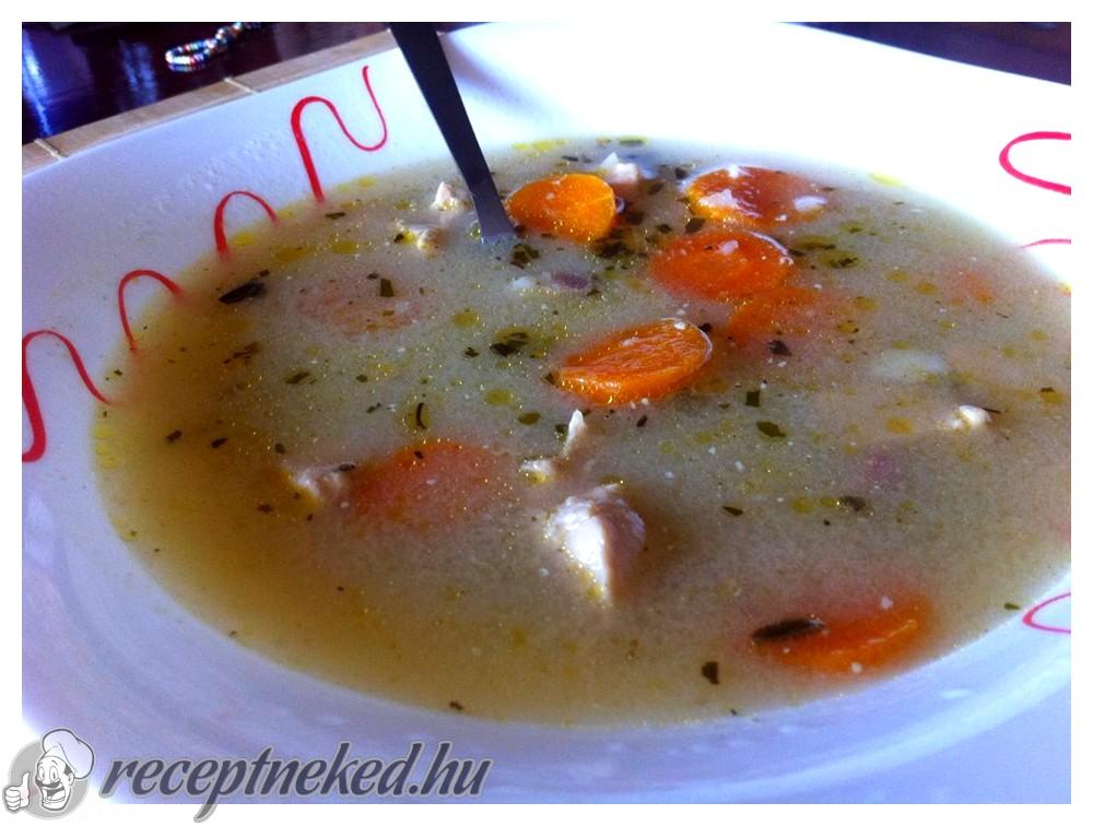 A csirkemellet és a füstölt szalonnát felkockázzuk, a hagymát és a sárgarépát felszeleteljük. Kevés zsiradékot hevítünk, majd hozzáadjuk a szalonnát és a hagymát. Amikor a hagyma üvegesre párolódik, beleöntjük a csirkemellet, és fehéredésig pirítjuk. Ekkor megfűszerezzük, és forró vízzel felengedjük.