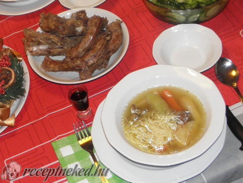 Tálalásnál külön kínáljuk a főtt húst és a zöldségeket. Aki szereti tesz a levesébe külön.