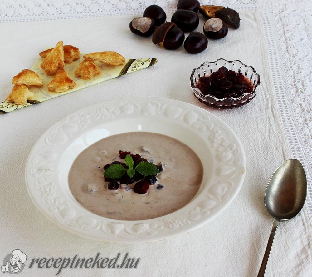 A hagymát apróra vágjuk és kevés kókuszzsíron egy edényben üvegesre pirítjuk. Hozzáadjuk a karikára szelt sárgarépát. Sózzuk, borsozzuk és pár perc után felöntjük a vízzel, beledobáljuk a főtt gesztenyét és puhára főzzük. Beleöntjük a tejszínt, még egyszer felforraljuk, majd a mézzel édesítjük és végül botmixerrel pürésítjük. Tejszínhabbal és gluténmentes rizsgolyókkal kínáljuk.