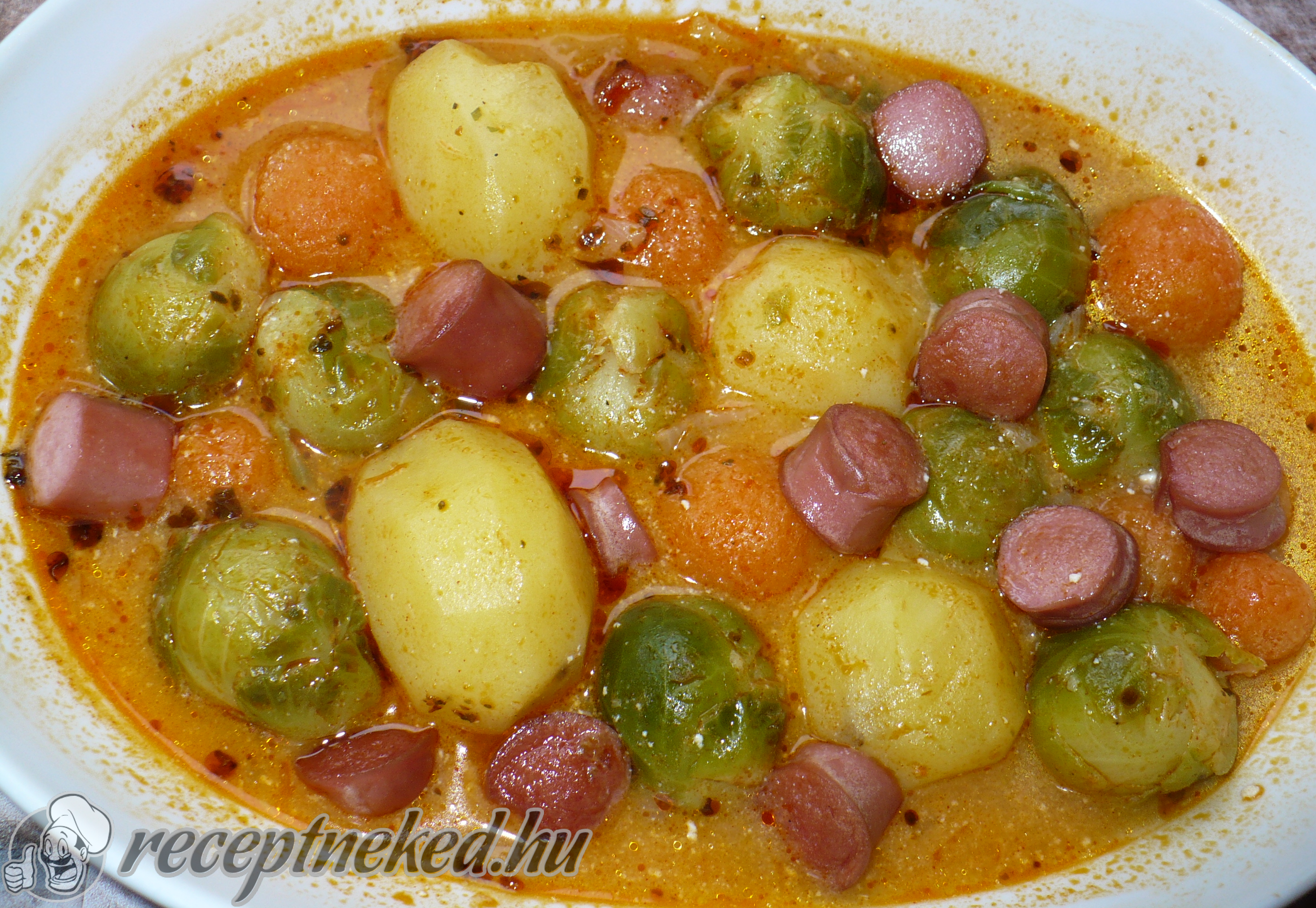 Ezalatt kevés olajon megpirítjuk a karikára vágott virslit. Aki főzni szeretné a virslit az a habarás után tegye a levesbe.