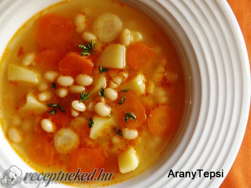 A hagymát az olajon üvegesre pároljuk, majd átforgatjuk rajta a babot. Felengedjük vízzel és hozzáadjuk a leveskockát, a darált paprikát, sózzuk, borsozzuk. Fedő alatt addig főzzük, míg a bab épp teljesen meg nem puhul. Hozzáadjuk a répát, zöldséget, krumplit.