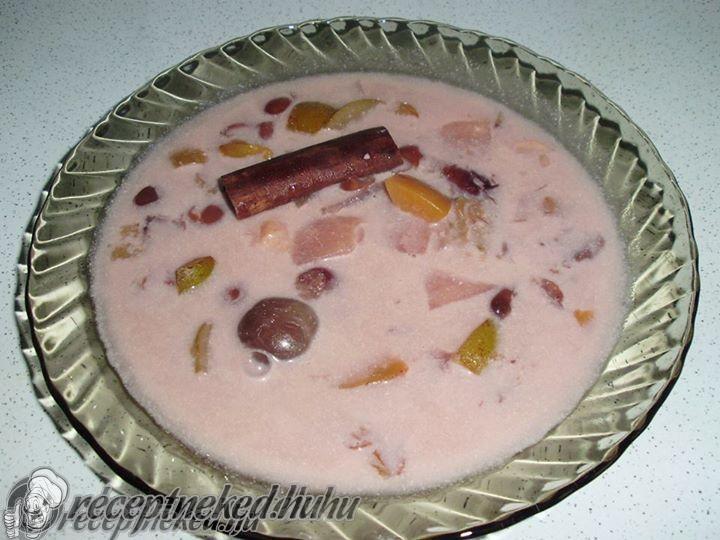 A fenti hozzávalókat összekeverjük egy edénybe, majd feltesszük főni. Ha a befőttek megpuhultak akkor a tejszínben elkeverjük a pudingport, elkeverjük egy kis leveslével, majd folytonos keverés mellett a leveshez adjuk és összeforraljuk. Ha van otthon, akkor lehet a leveshez adni joghurtot is, ezt a habarás előtt.