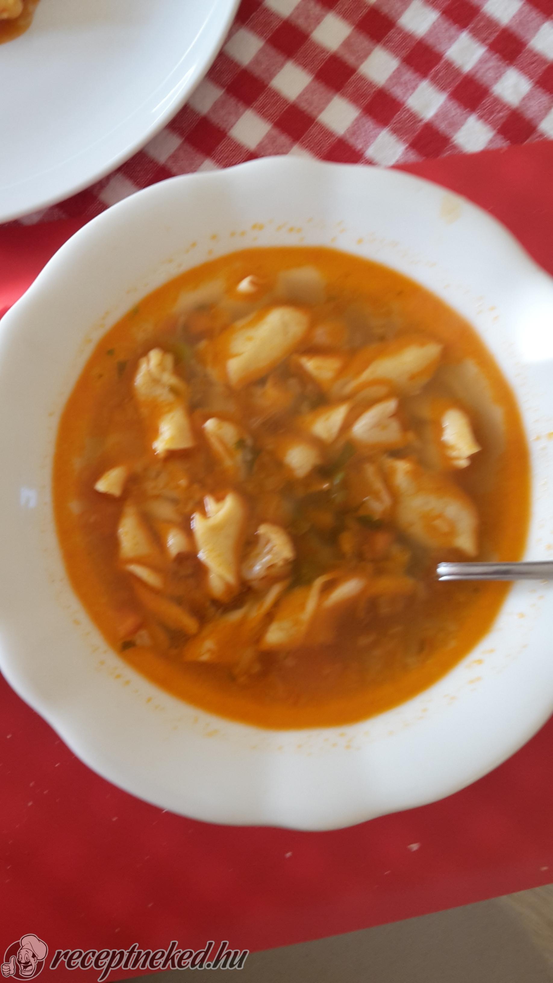 Közben a megmaradt hagymás zsírt felöntjük 1-1,5 liternyi vízzel, beletesszük a leveszöldséget, az apróra vágott krumplit, megsózzuk.