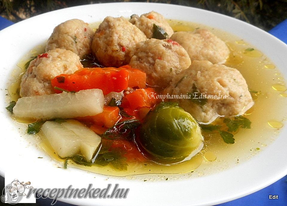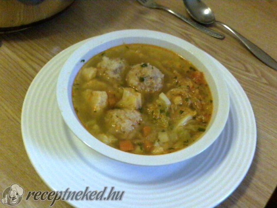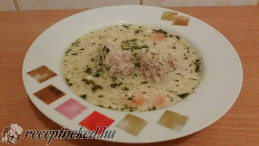 Közben a húst összekeverjük a rizzsel, tojással, a zúzott fokhagymával és ízlés szerint sóval, borssal. Vizes kézzel kisebb gombócokat formázunk a masszából, majd a levesbe engedjük óvatosan.