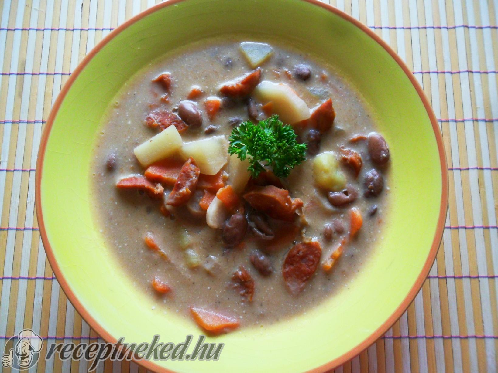A répaféléket megtisztítjuk és feldaraboljuk, a kolbászt leöblítjük és vékonyan felkarikázzuk, majd a babérlevéllel a teatojásba zárt fokhagymával és borssal együtt a babhoz adjuk és az egészet puhára főzzük.