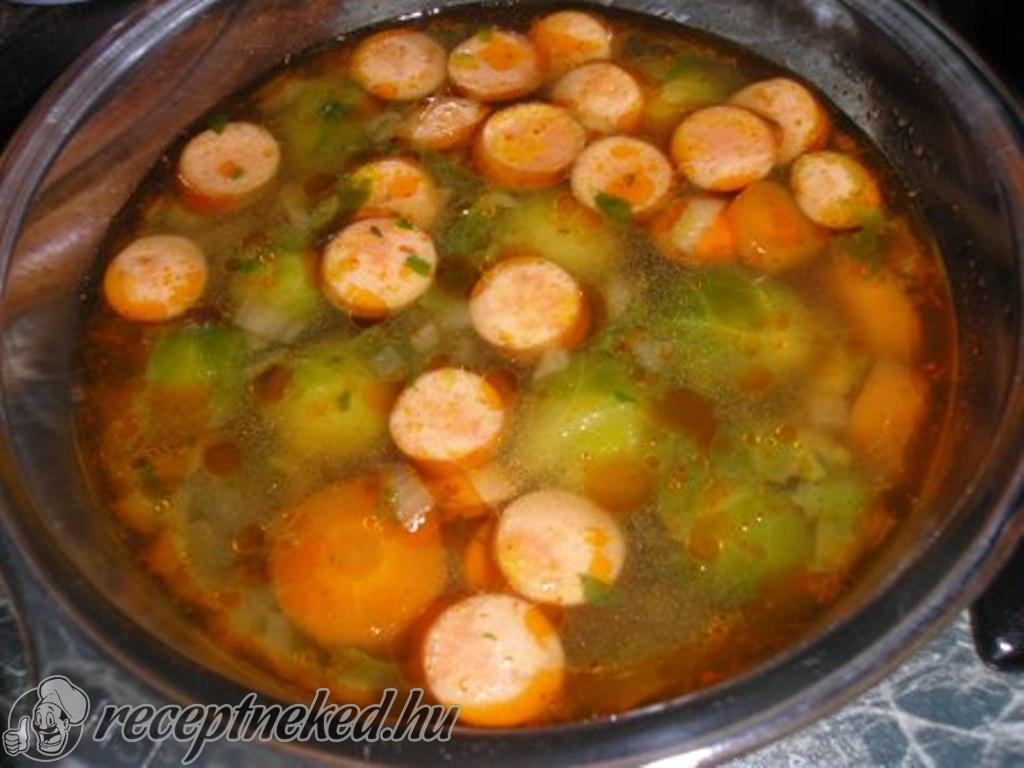 Ha felforrt a levesünk, ételízesítővel ízesítjük. Ha megpuhultak a zöldségek, a karikákra vágott virslit és az apróra vágott petrezselymet hozzáadjuk, és készre főzzük.