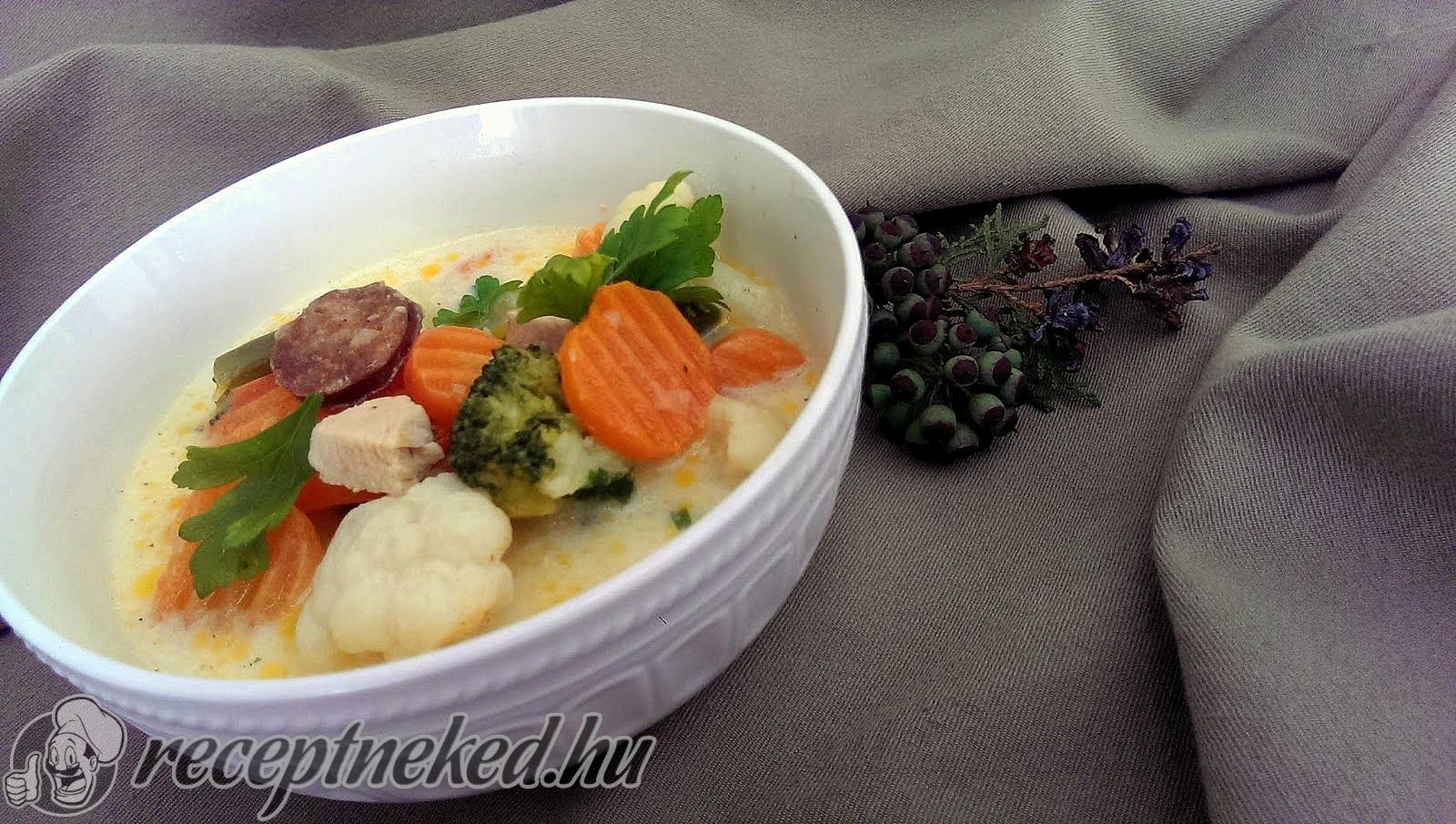 A zöldségeket: sárgarépát, fehérrépát felkarikázva, a petrezselymet apróra vágva, paprikát kockázva, a karfiolt, brokkolit rózsáira szedve belerakjuk a levesbe (a borsó kivételével, mert azt csak a vége felé tesszük bele)így főzzük.