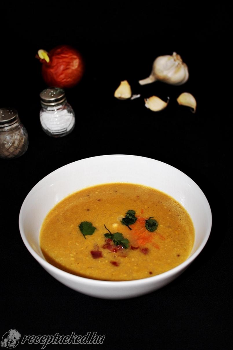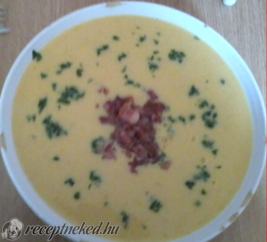 A kész levest a ropogós szalonnával és az újhagyma karikázott zöldjével megszórva tálaljuk.