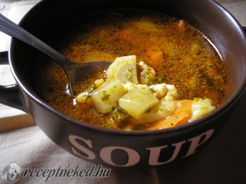 A burgonyát meghámozzuk, kockákra vágjuk, a zöldségeket felkarikázzuk. A zellert felkockázzuk, majd a kétféle zöldet apróra vágjuk és egy 2 literes fazékban olajon pirítani kezdjük.