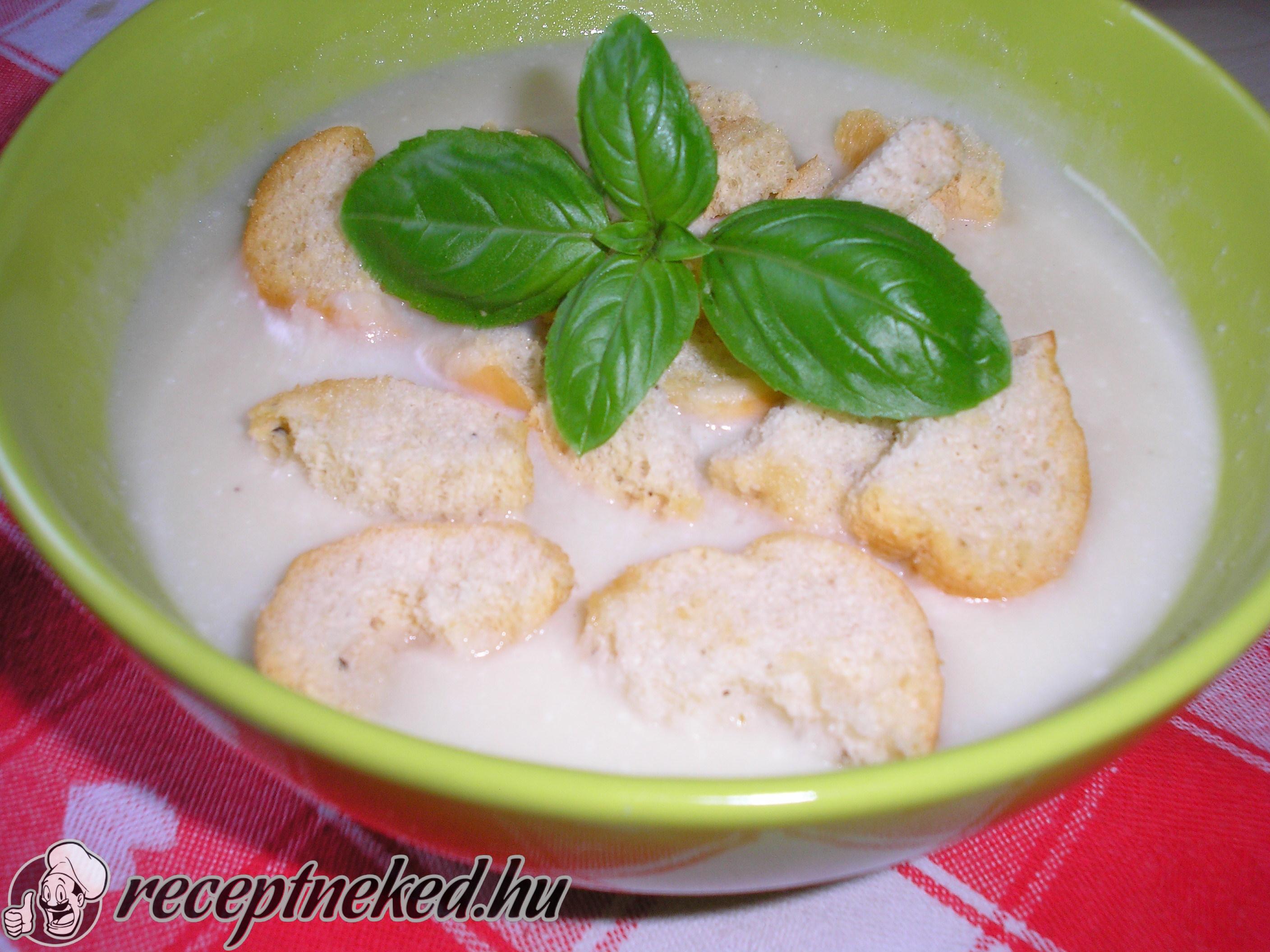 Pirított zsemlekockákkal és ízlés szerint olívaolajjal tálaljuk.