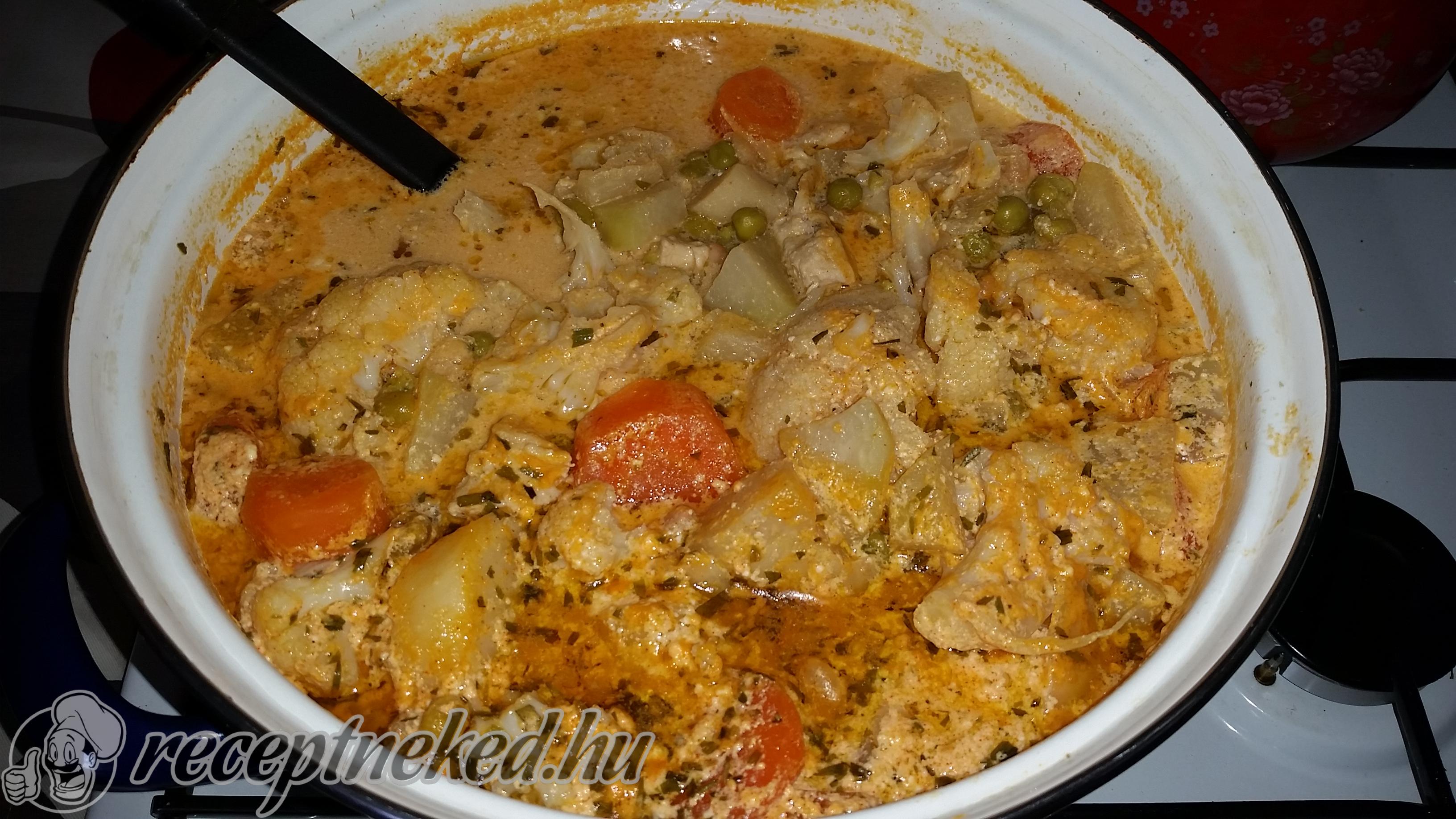 A hagymát megpirítotjuk kevés olajon, ezután belerakjuk a zöldségeket és pároljuk.