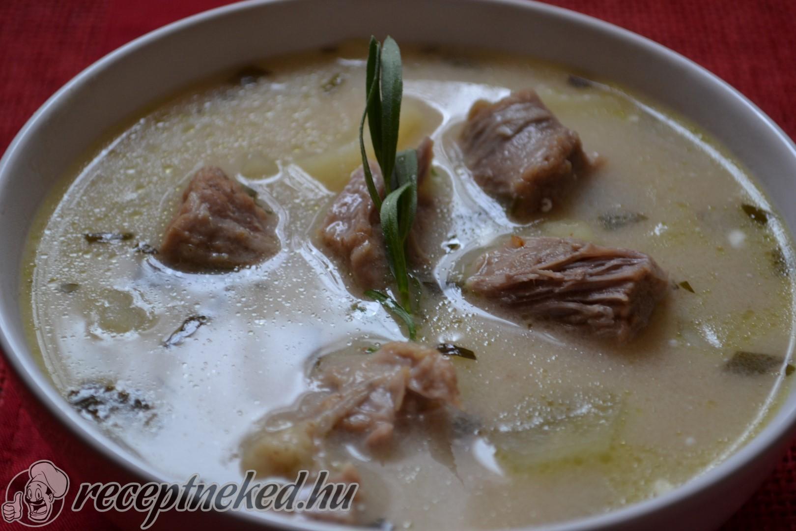 A csontról leszedjük a húst, és csak azt tesszük már vissza a levesbe, majd behabarjuk: a tejfölt csomómentesre keverjük a tejföllel, hozzáadjuk a tejszínt, ezzel is elkeverjük, majd egy merőkanálnyi levest adunk hozzá (hőkiegyenlítés). Elkeverjük, és a leveshez adva, folytonos kevergetés mellett behabarjuk.