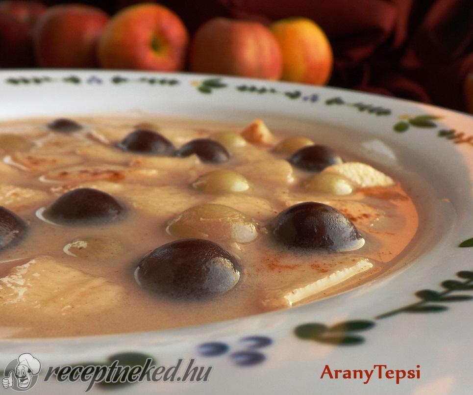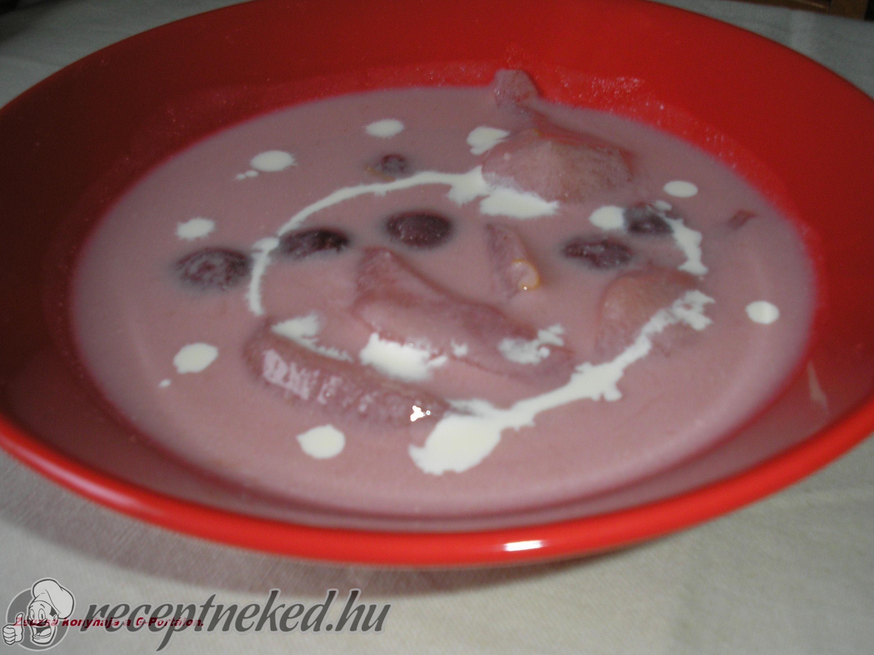 A meghámozott, felkockázott almát és barackot egy fazékba tesszük, hozzáadjuk a meggybefőtt levét és annyi vizet, amennyi levest szeretnénk. Cukrozzuk, ha nem találjuk elég édesnek és kb 10 percig főzzük a gyümölcsöket.