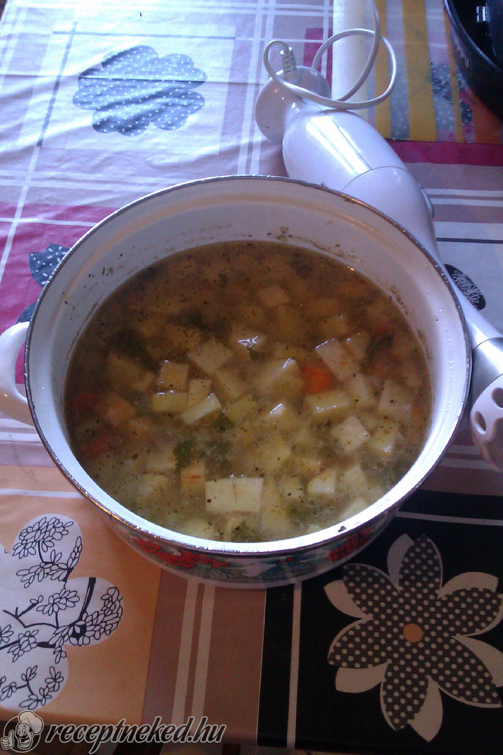 Felöntjük 1 liter húslevessel, sóval, borssal és majoránnával ízesítjük, majd forrástól számítva 15–20 percig lassú tűzön főzzük, amíg a zöldségek teljesen megpuhulnak.