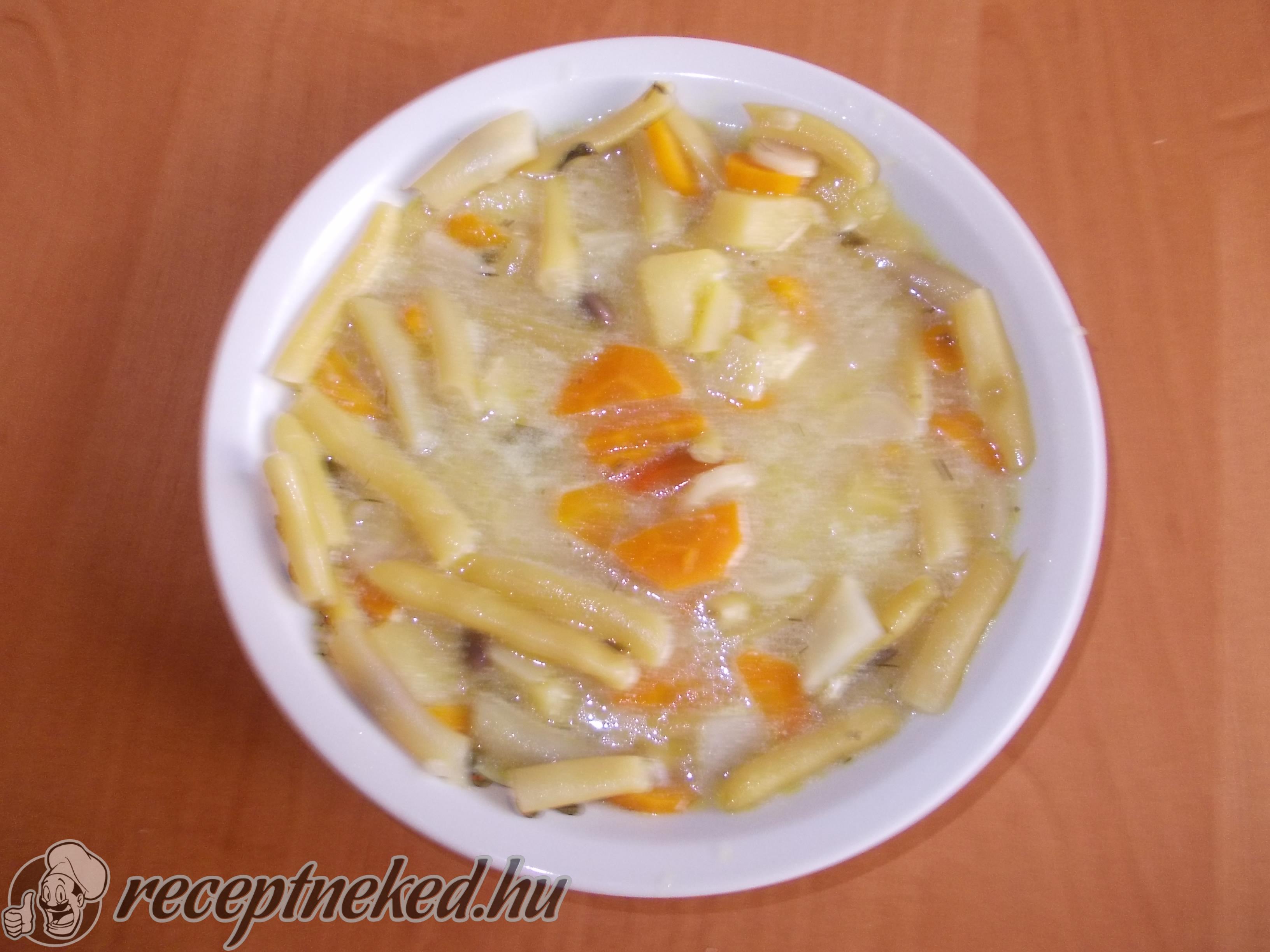 Beleteszem a kb. 2-3 cm-esre vágott, vagy tördelt zöldbabot és felöntöm vízzel. Mikor a leves felforrt, a főzést takarékra állítom.