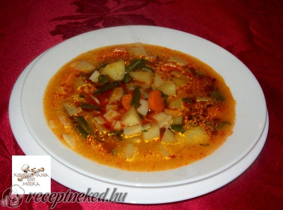 A zöldségféléket kevés olajon a többi hozzávalókkal együtt megpároljuk, vízzel felöntjük, hozzáadjuk a zöldbabot és a kockákra vágott krumplit. Puhulásig főzzük.