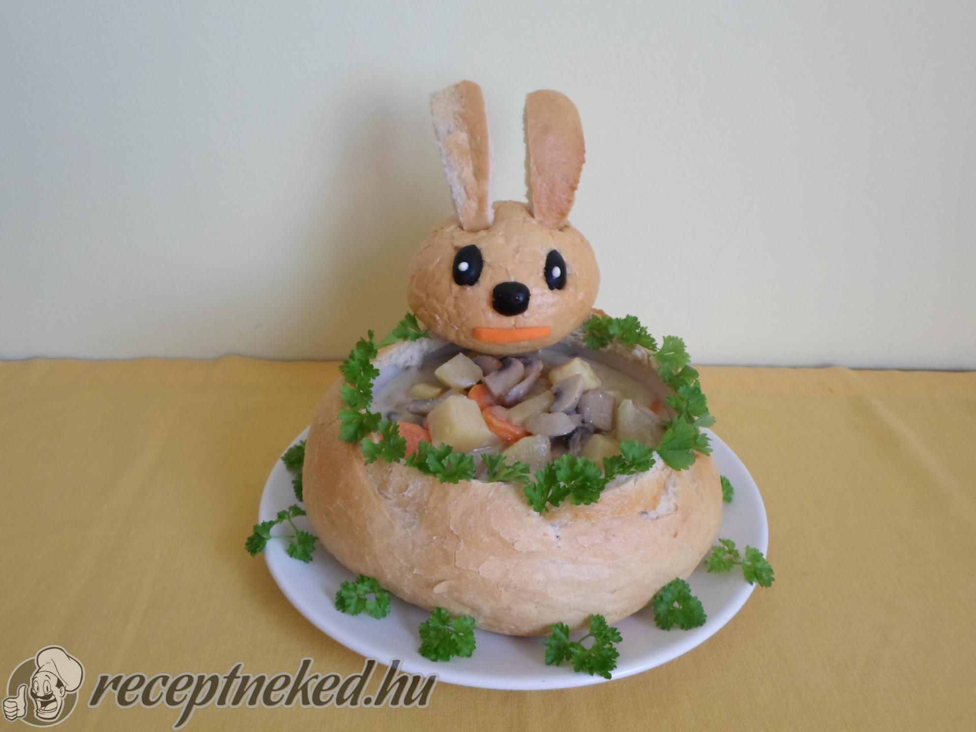 Elővesszük a cipónkat. A tetejét levágjuk, ebből kivágjuk a nyuszi füleit, a belsejét kiszedjük, beletesszük egy mélyebb tányérba, majd telemerítjük levessel.