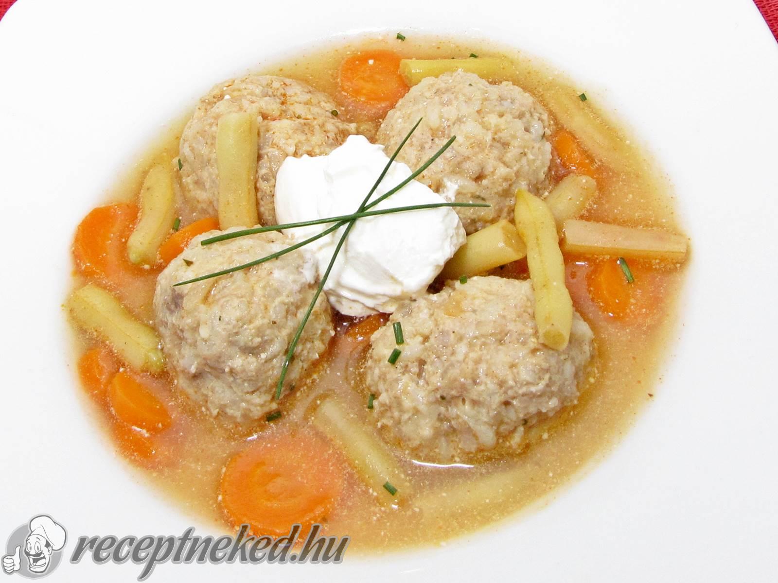 Mikor felforrt, hozzáadom a zöldbabot, az apróra vágott snidlinget, a lestyánlevelet. Ezt rövid főzés után kiemelem a fazékból. A lébe beleteszem a húsgombócokat, és mikor újra felforrt, a gombócok feljönnek a leves tetejére. Ettől kezdve újabb 5 percig főzöm.