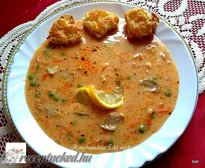 A tejszínnel besűrítjük, a citromot kiszedjük a levesből és tálaljuk.