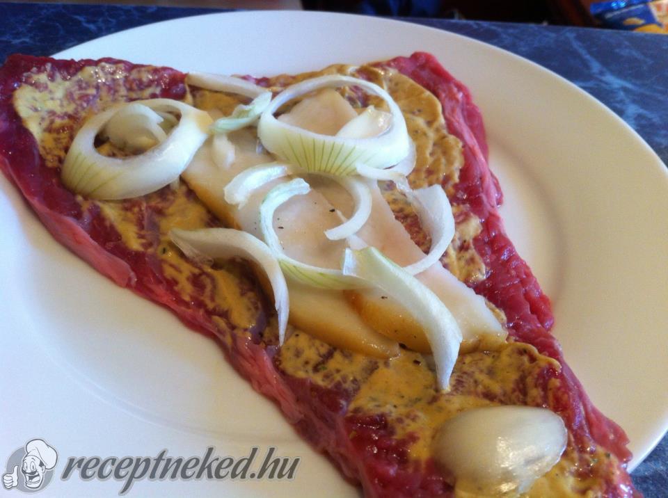 Ezután kenjük meg mustárral és tegyünk rá 1 szelet szalonnát, majd néhány karika hagymát. (sokan csemege uborkát is tesznek bele, mi nem). A hús szeleteket tekerjük fel és erősebb cérnával rögzítsük. Hústűt nem használunk hozzá, mert a serpenyőben forgatni úgy nehezebb.