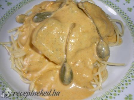 A tejfölt a maradék kb. 1 evőkanál liszttel összekeverjük, a rostélyosok zöldséges levét ezzel sűrítjük, és botmixerrel pépesítjük..Utánasózzuk. Visszetesszük a húst a mártásba. Köretnek spagettit kínálunk hozzá.