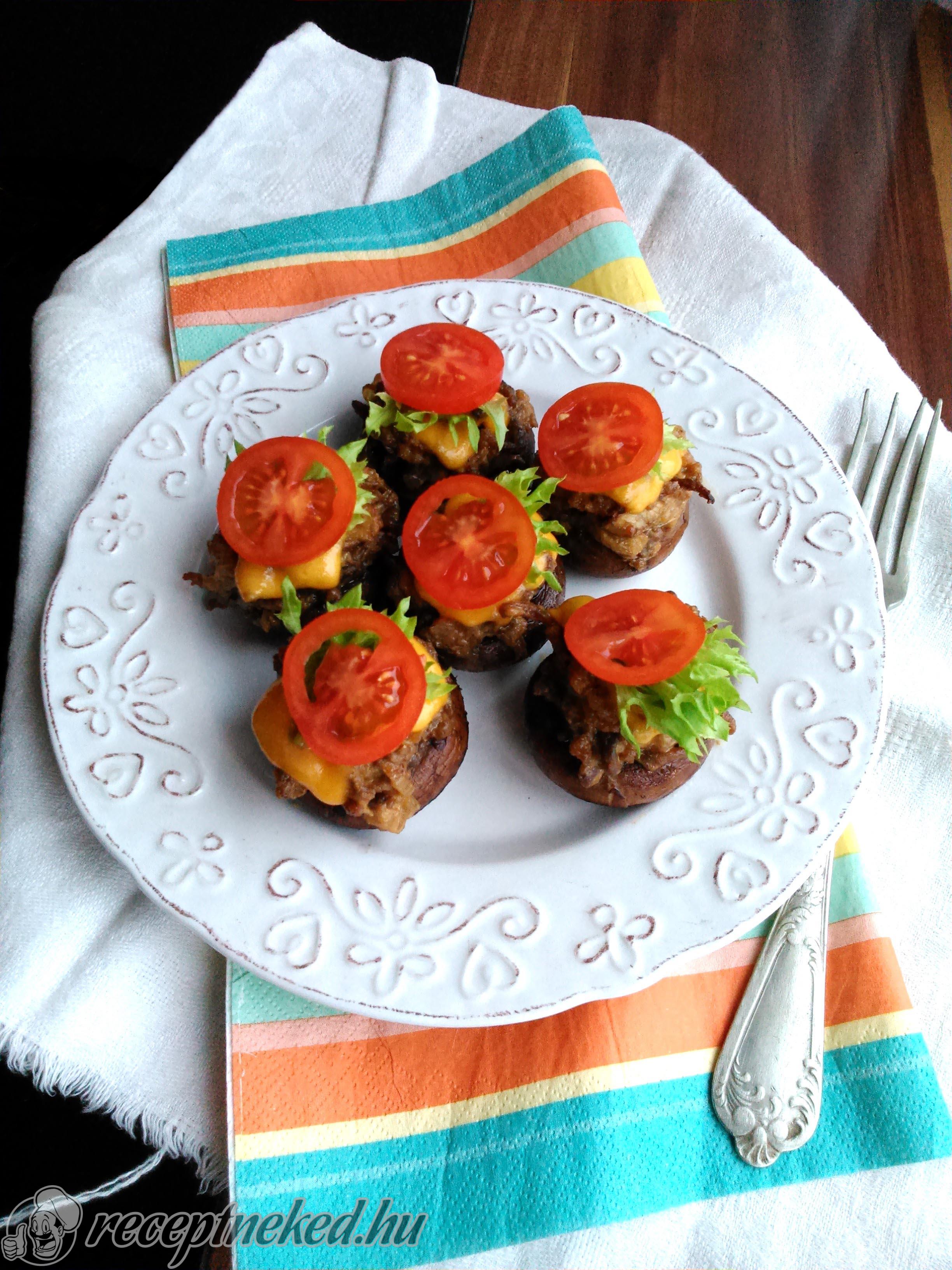 A sütőből kivesszük a gombaburgereket, elzárjuk a gázt és a halmok tetejére tesszük a sajtszeletkéket. Pár percre visszatoljuk a még meleg sütőbe, míg a sajt ráolvad.