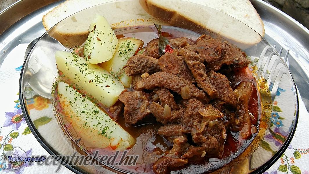 Egy lábasban felhevítjük a zsírt, majd rádobjuk az apróra kockázott vöröshagymát és megdinszteljük. Hozzáadjuk a zúzott fokhagymát, a lecsót, a fűszerpaprikát és a fűszereket. Gyorsan elkeverjük, majd felöntjük 1 liter vízzel és felforraljuk. Ha forr, takarékra vesszük, hozzáadjuk a csíkokra vágott pacalt és a felkockázott marhahúst. Hozzáöntjük a vörösbort. Összekeverjük, és ha úgy érezzük, hogy kevés a lé alatta, akkor kevés vizet adhatunk még hozzá. Újraforraljuk, majd takarékon, lefedve 2,5 órán át főzzük. Időnként keverjük át, és kóstoljuk meg. Ha szükséges, ízesítsük még, és pótoljuk az elfőtt folyadékot vízzel.