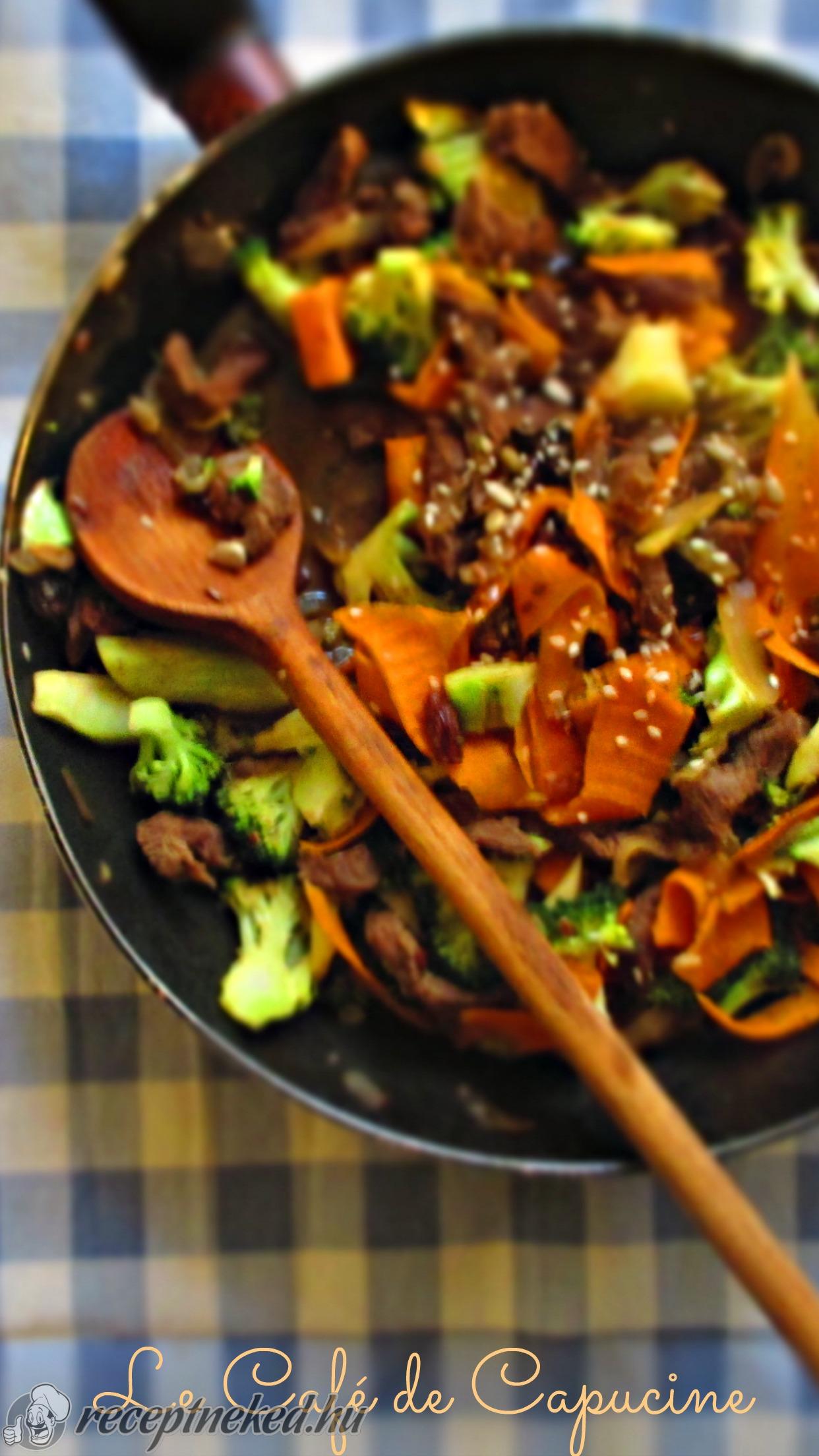 Egy nagy wokban olajat forrósítunk, majd megpirítjuk rajta a húst. Figyeljünk, hogy ne ragadjanak össze, minden oldaluk szépen megpiruljon.