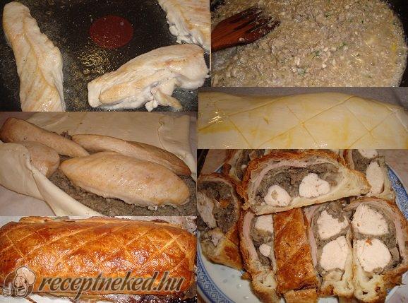 A leveles tésztát, ha nem nyújtottat használunk, akkor kinyújtjuk, majd a húst becsomagoljuk és a végeit jól összenyomkodjuk.