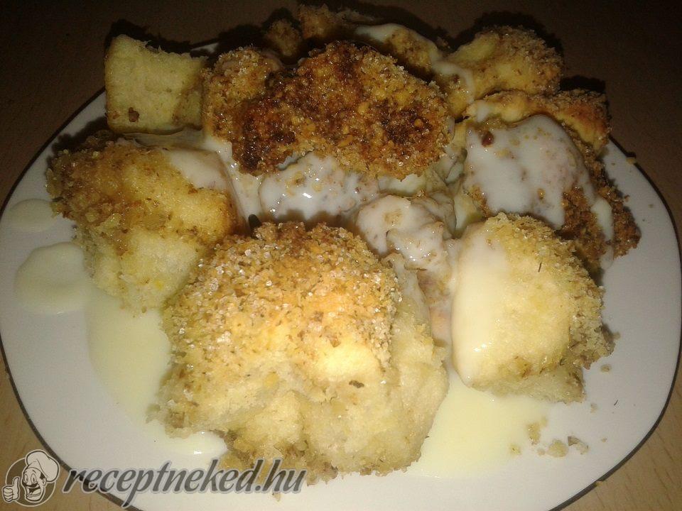 Egy tűzálló tálat vagy tepsit margarinnal kikenünk és olvasztott margarinba mártott kanállal beleszaggatjuk a tésztát.