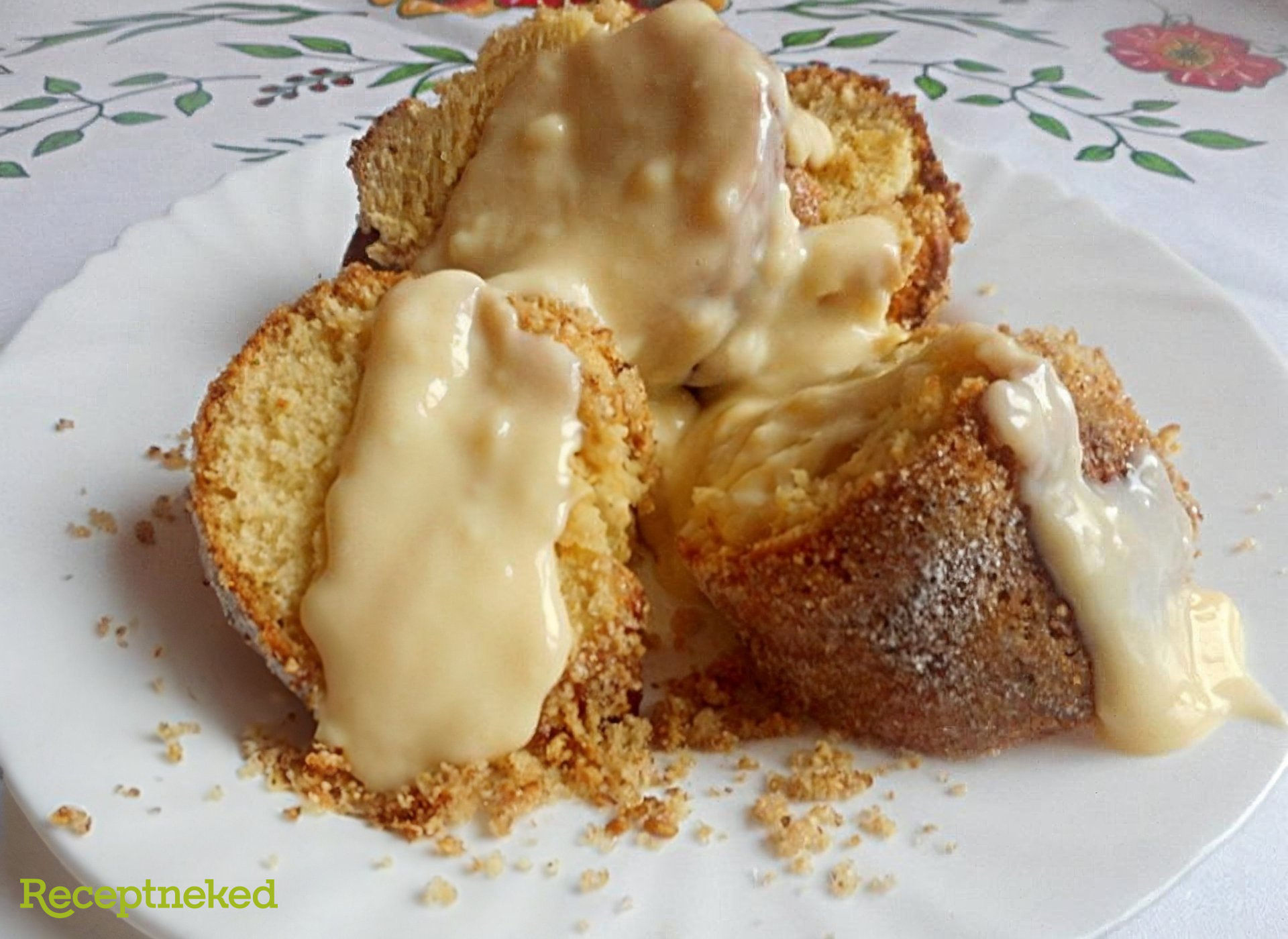 A megsült galuska koszorút srégen feldaraboljuk, majd a híg vanília pudinggal meglocsoljuk.
