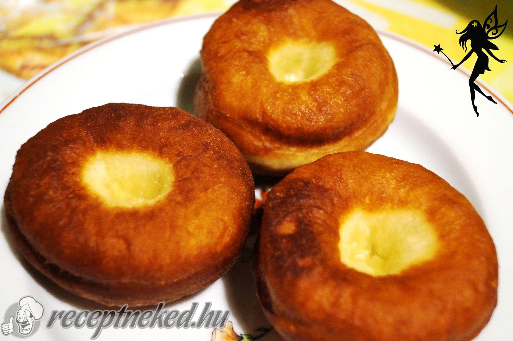 Egy nagyobb edényben a zsiradékot felforrósítjuk, majd beletesszük a fánkokat úgy, hogy a fánkok felső részre (ami nem érte az asztalt), az kerüljön először az olajba (tehát megfordítva). Egyszerre ne tegyünk sok fánkot az edénybe! Fedővel lefedjük, majd amikor már szép pirora sült, akkor megfordítjuk és már fedő nélkül sütjük készre.